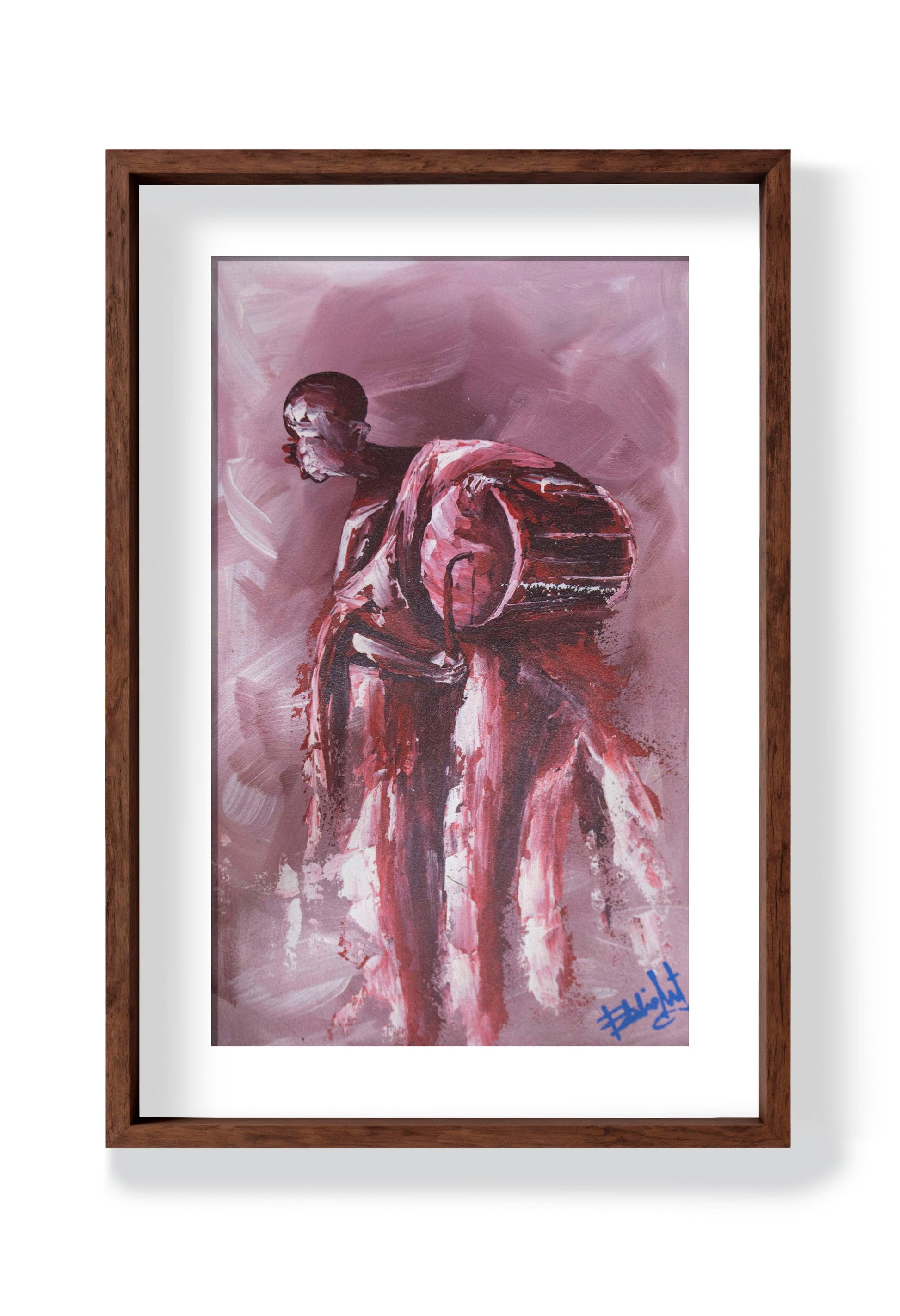 This expressive original captures that moment of resonance: coral pinks and earthen reds swirl like dawn mist, the figure bent in motion, the gong a bold arc of sound frozen in paint. Abstract yet deeply rooted, the piece hums with quiet power.