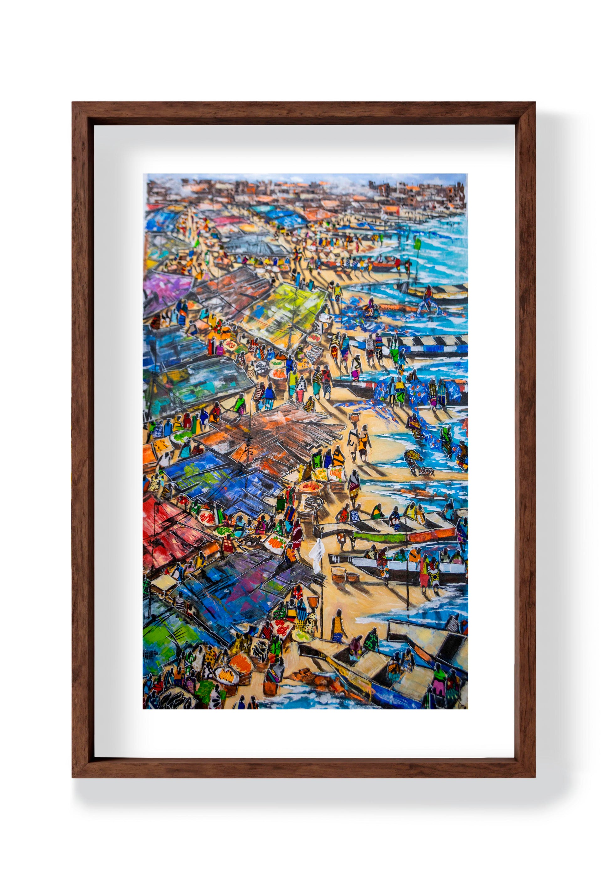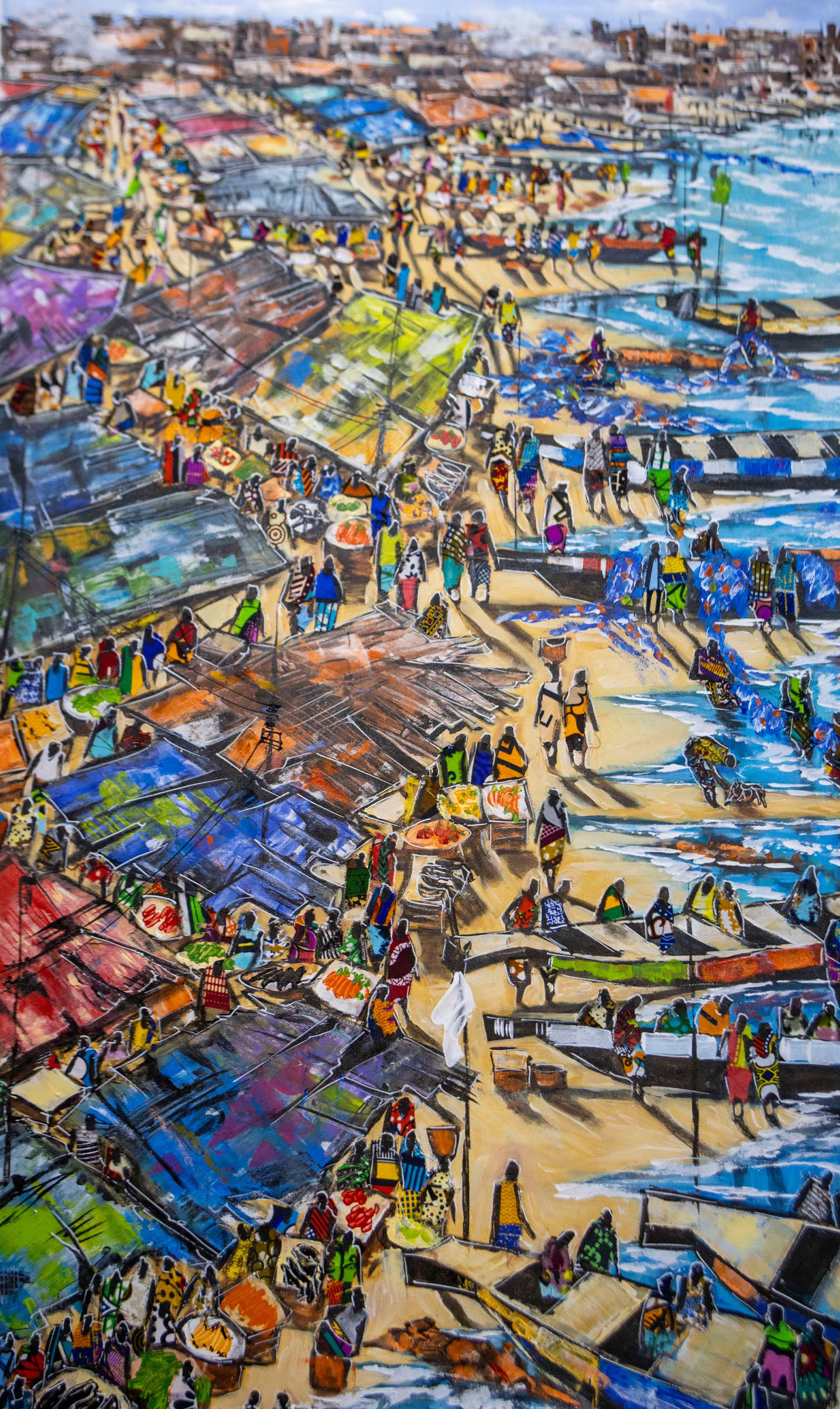Threads of Fortune depicts a coastal fish market at midday, viewed from above. The scene is rendered in acrylic, while the figures’ clothing is collaged from Ankara fabric, adding texture and cultural depth to the composition.