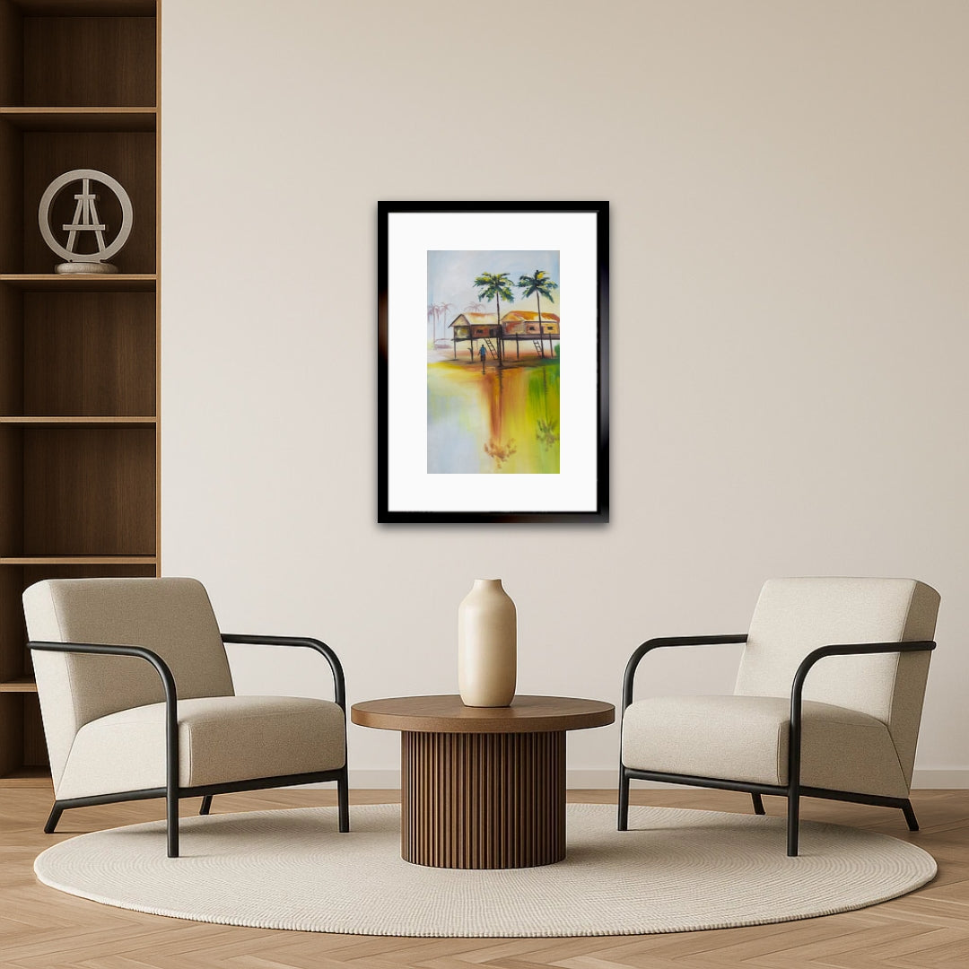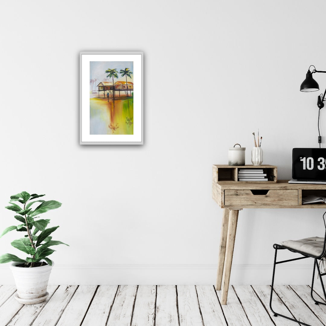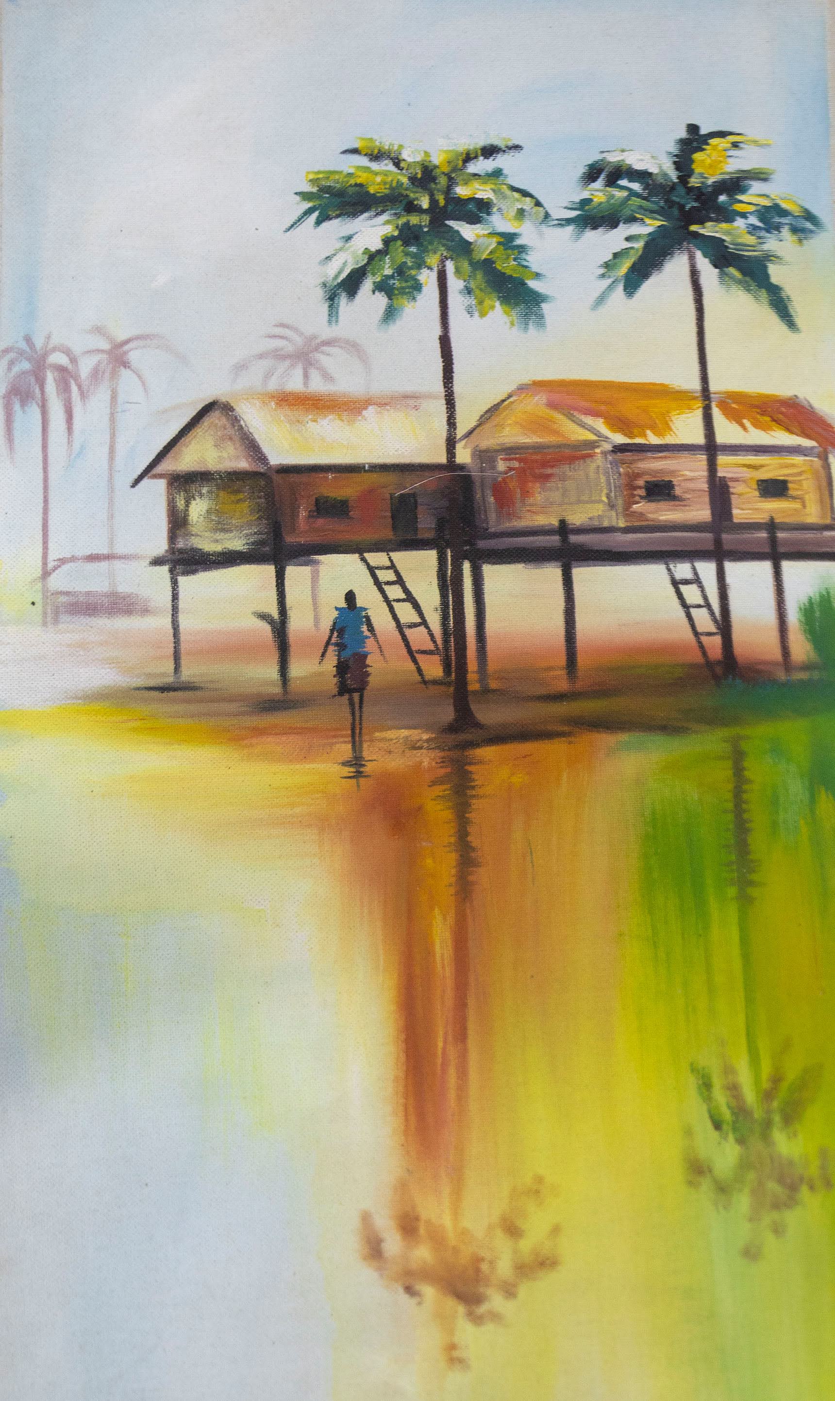 An ode to Ghana’s fishing communities, Stilt Village captures life balanced above the water — a reflection of both harmony and adaptation. Rooted in the ingenuity of Africa’s coastal people, this painting speaks to a timeless resilience in the face of rising tides and changing climates.